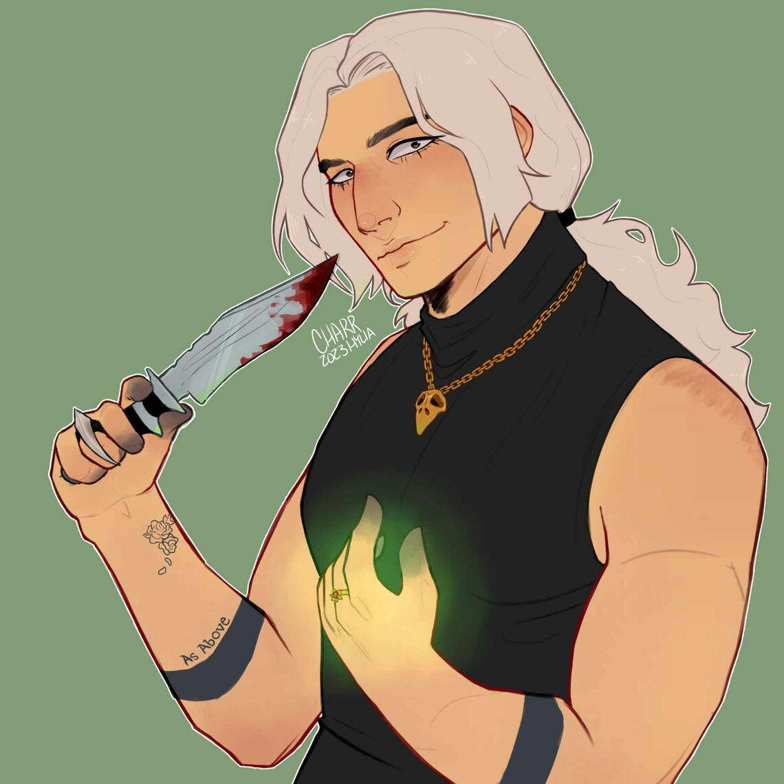 Commission; artist is miyaarteVasille is a tall, lightly muscled man in his early thirties. His hair is a natural silvery blonde tone, which he typically wears long and free; though on occasion, he will braid it back, in which it falls to the small of his back. His eyes are a clear hazel tone. He holds scars along his biceps resembling ropes from an accident a few years back, as well as a large burn scar on left shoulder blade from a work-related injury. The tips of his fingers are gray- it isn’t noticeable unless one really studies it. It’s a side effect of his ability; the beginning stages of decay. It will continue to progress as he uses his ability unless he can find a way to cease the growth. Due to this, he has begun to lose feeling down to the first knuckle on each finger. BODY TYPE : Endomorph