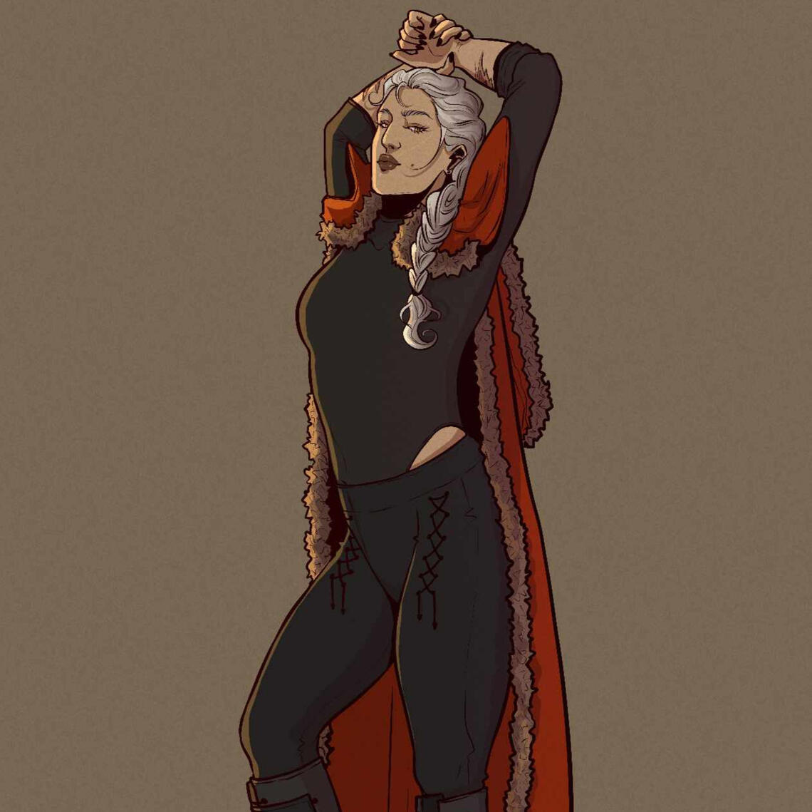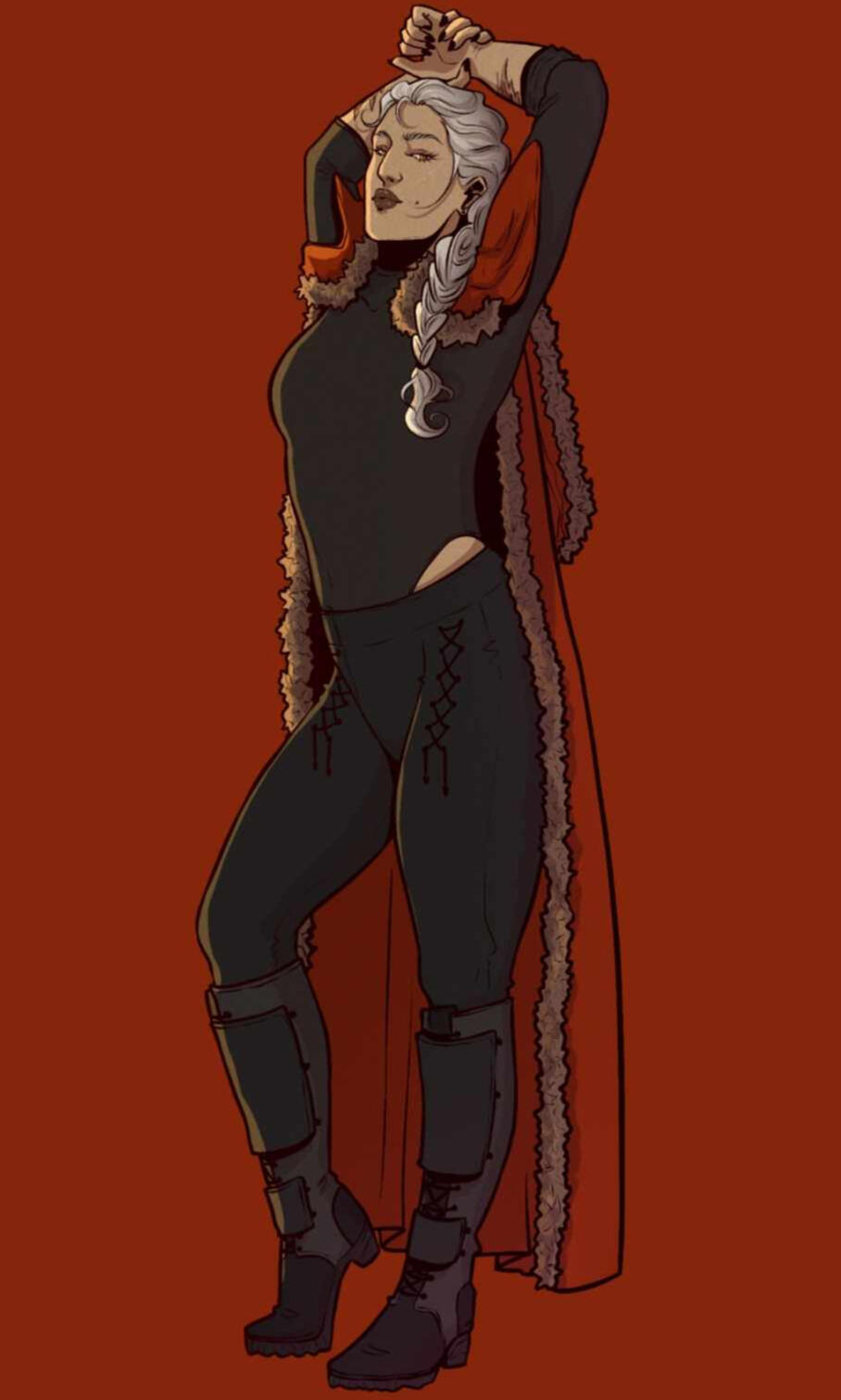 -Deep red hooded cloak that aids in keeping her warm during her travels north. Due to being an essential reptile, she gets cold easily.